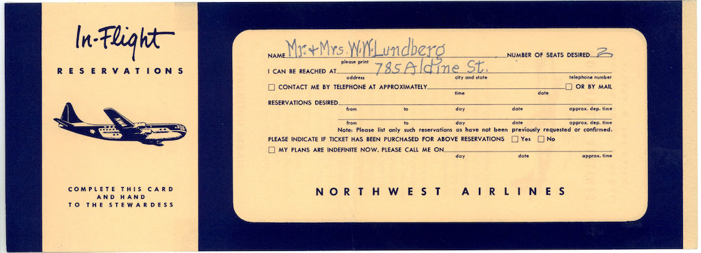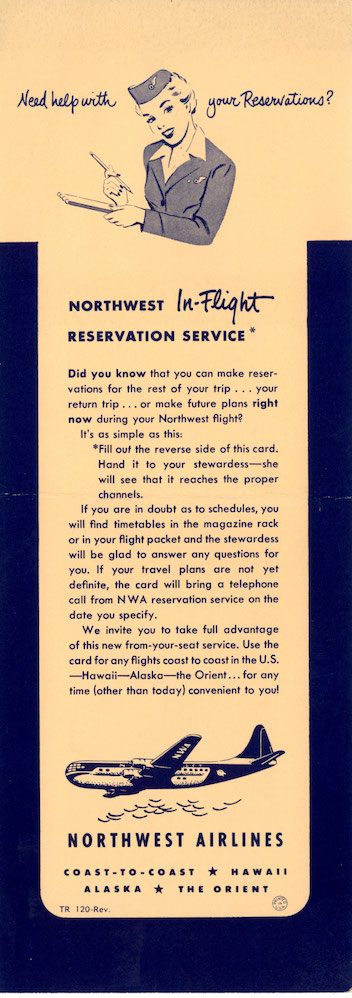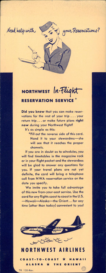 Home Memorabilia Brochures Northwest Airlines In-Flight Reservation Card 1950s 2 years ago 2 years agoNorthwest Airlines In-Flight Reservation Card 1950sIn-flight reservation card used by passengers of Northwest Airlines in the 1950s 1 min by Chris Sloan 2 years ago2 years ago171views Search the Airchive Post PaginationPrevious PostPreviousNext PostNextNorthwest Airlines, Northwest Airlines Memorabilia GalleriesLike it? Share with your friends! 0 0 Comments Cancel replyYour email address will not be published. Required fields are marked * Save my name, email, and website in this browser for the next time I comment. ΔThis site uses Akismet to reduce spam. Learn how your comment data is processed.